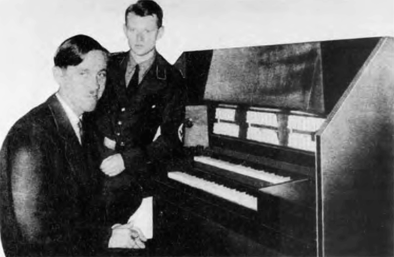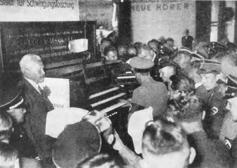 “In the spring of 1933, after finishing his studies in Cincinnati, Kock became exchange fellow at the Technical University of Berlin. He had heard of Karl Willy Wagner’s work and wanted to conduct doctoral research with him at the Heinrich Hertz Institute. Kock’s counterpart as an exchange student from Berlin to Cincinnati was Sigismund von Braun, Wernher von Braun’s eldest brother. In Berlin Kock wrote a Ph. D. thesis on oscillations in inductive glow discharge circuits and, with Oskar Vierling, another student of Wagner’s, designed an improved electronic organ on the formant principle. Oskar Vierling, Kock’s collaborator on the Kock-Vierling organ, had studied electrical engineering at an engineering school and in 1925 joined the Laboratory of the German Research Institute for Telegraphy headed by Karl Willy Wagner. In 1928 he followed Wagner as his assistant to the newly founded ‘Institute for Vibration Research’ conducting acoustic research and designing electrified pianos and electronic organs. Together with the Nobel Laureate Walter Nernst he in 1931 designed the Neo-Bechstein piano, an electrostatic piano and from 1928 to 1935 developed his Electrochord for the piano manufacturer Förster. The National Socialist Strength through Joy organization sponsored Vierling’s ‘Strength through Joy Organ’ which was played at the Olympic Games in Berlin in 1936. This enlarged and improved version of the Kock-Vierling model created a sensation as did his electrically generated bell sounds which he presented at the National Socialist Party Rally in Nuremberg a year later.8 Fascination by technology, electricity and electronics,surprising effects, glorious sounds, this was food for the masses and much appreciated by the party propagandists. Vierling’s mentor Karl Willy Wagner must have watched his former assistant’s success with very mixed feelings, having himself been forced to resign from his directorate of the Heinrich Hertz Institute in 1936. There is an irony in the fact that Kock,who played a significant role in the US War effort during World War II, contributed, although unintentionally, to enhancing Nazi propaganda efforts.”