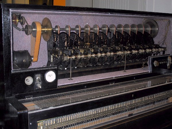 The Superpiano created complex tones by allowing a combination of ‘pure’ and harmonic sound waves of the same note; each note was duplicated with contrasting sound waves and harmonics – hence two rows of twelve disks – allowing the player to mix the sound waves of each note with a knee lever. Volume control was achieved by adjusting the pressure on the manual keyboard via variable resistors, thereby dimming and increasing the lightbulb brightness and, consequently, the note volume. The instrument’s overall pitch can be adjusted during play by varying the speed of the rotating disks. Spielmann intended the Superpiano to be used as an affordable ($300) home keyboard which could be played like a piano but also a type of early sampling keyboard – ‘drawings’ of different instruments’ waveforms could be made on the celluloid disks, allowing the player to reproduce the “entire instrumental range of an orchestra” – or so the advertising claimed.