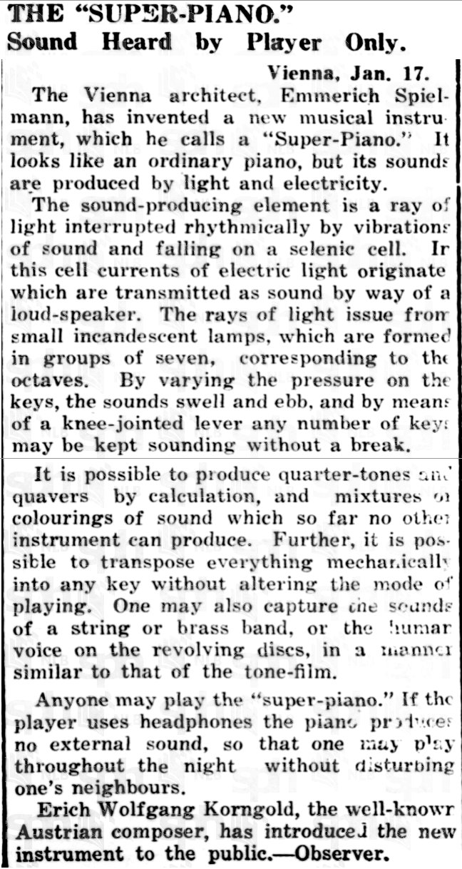- 1Spielmann, Emerich (1933) WIE ICH DAS SUPERPIANO ERFAND, Radio Wien, 31 March 1933, 3.